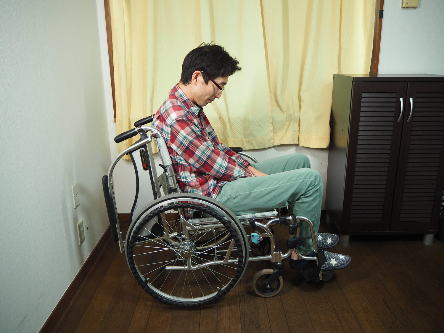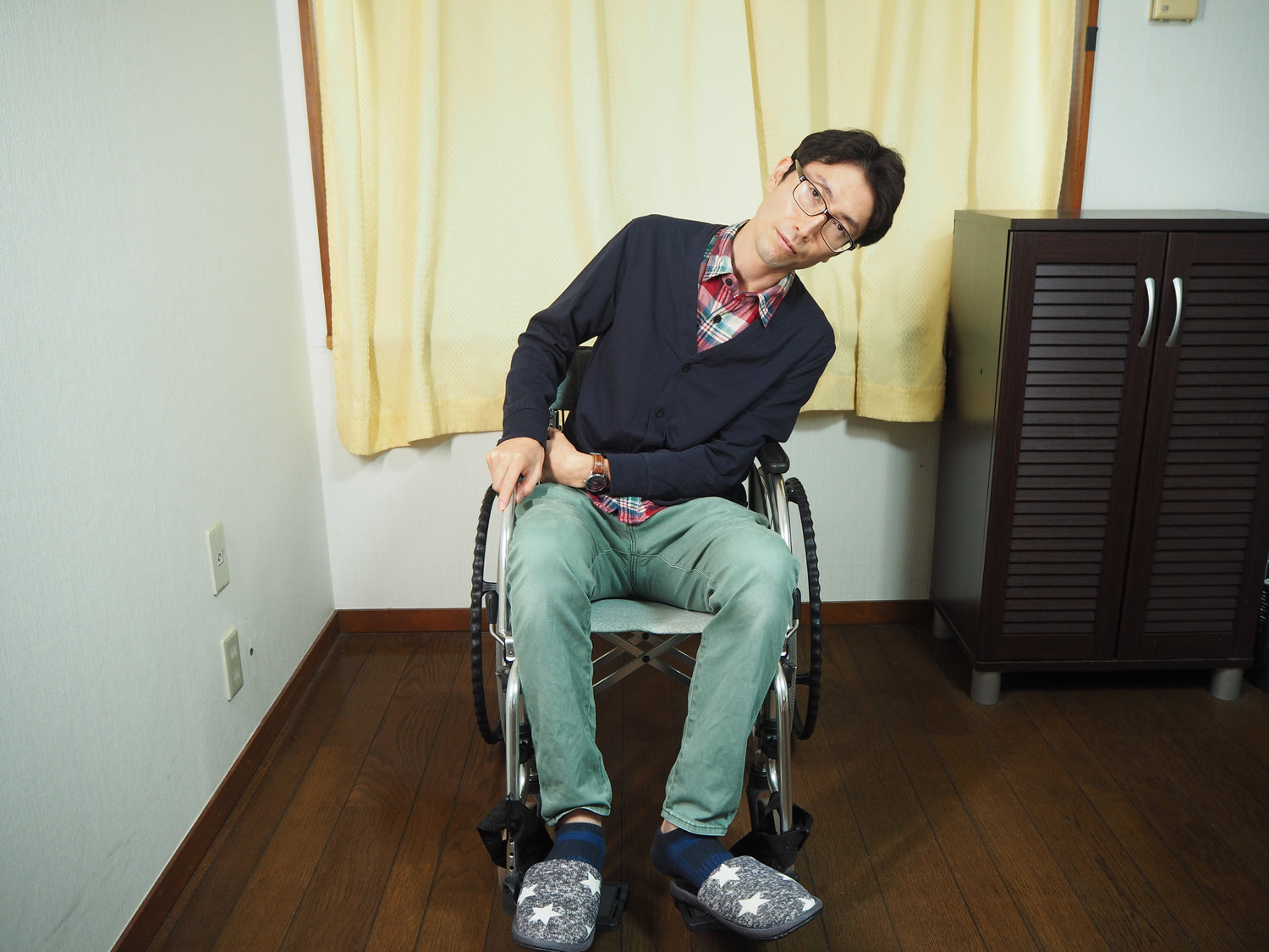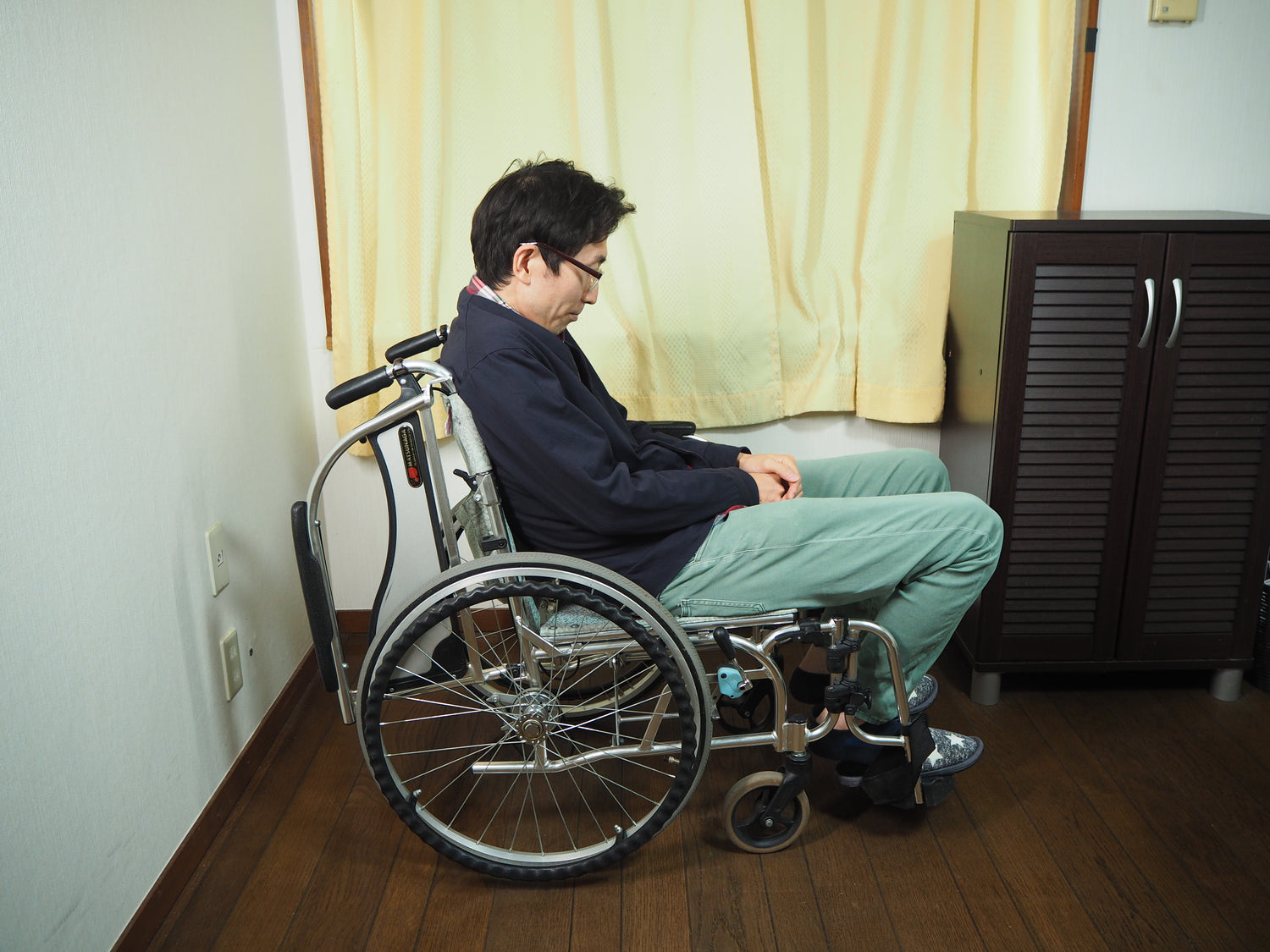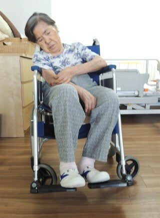 片麻痺のある方は、体が麻痺側に傾きやすいものです。健側に傾くこともあります。車いすに座った状態で、このような不安定な姿勢を続けていると、転倒の恐れがあります。