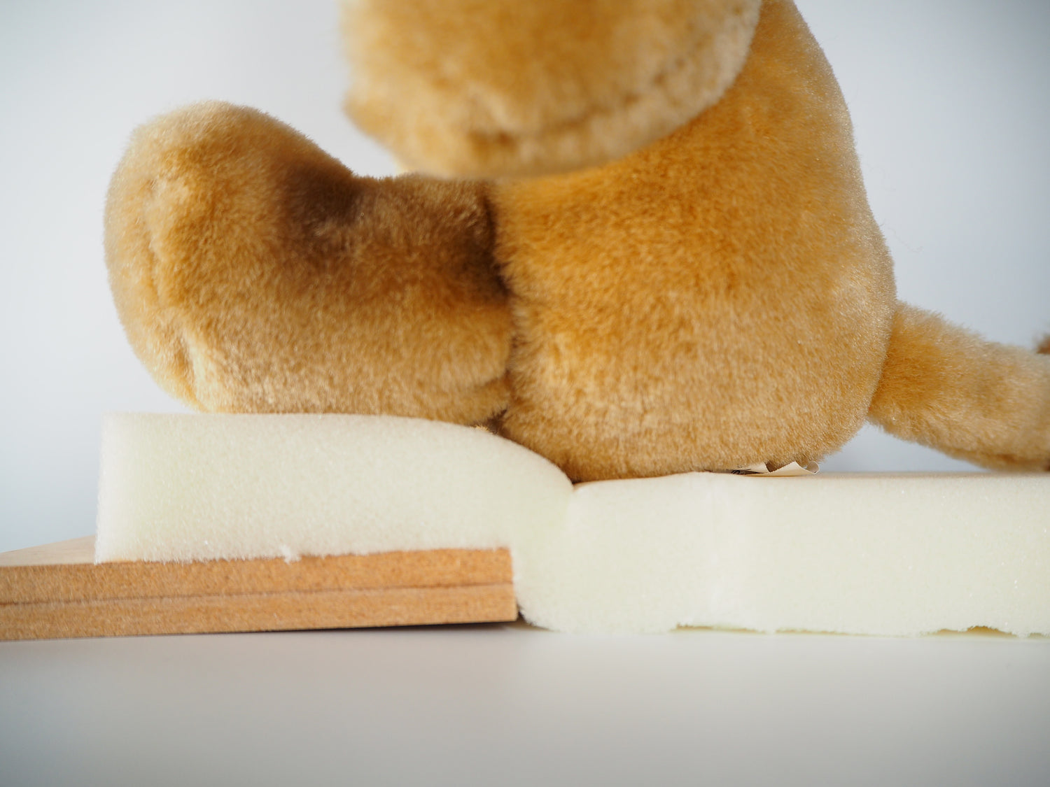 ノビットシステムの「座クッション」は、この問題を解消します。クッションの裏側の前端に小さな板を貼ってあり、これによってたるみが解消します。お尻(坐骨)の下には板がないので、お尻がクッションに少し沈みこみ(アンカーサポートが得られ)、安定した坐りが得られます。その結果、ずっこけ座りを防ぎ、床ずれを予防することができます。