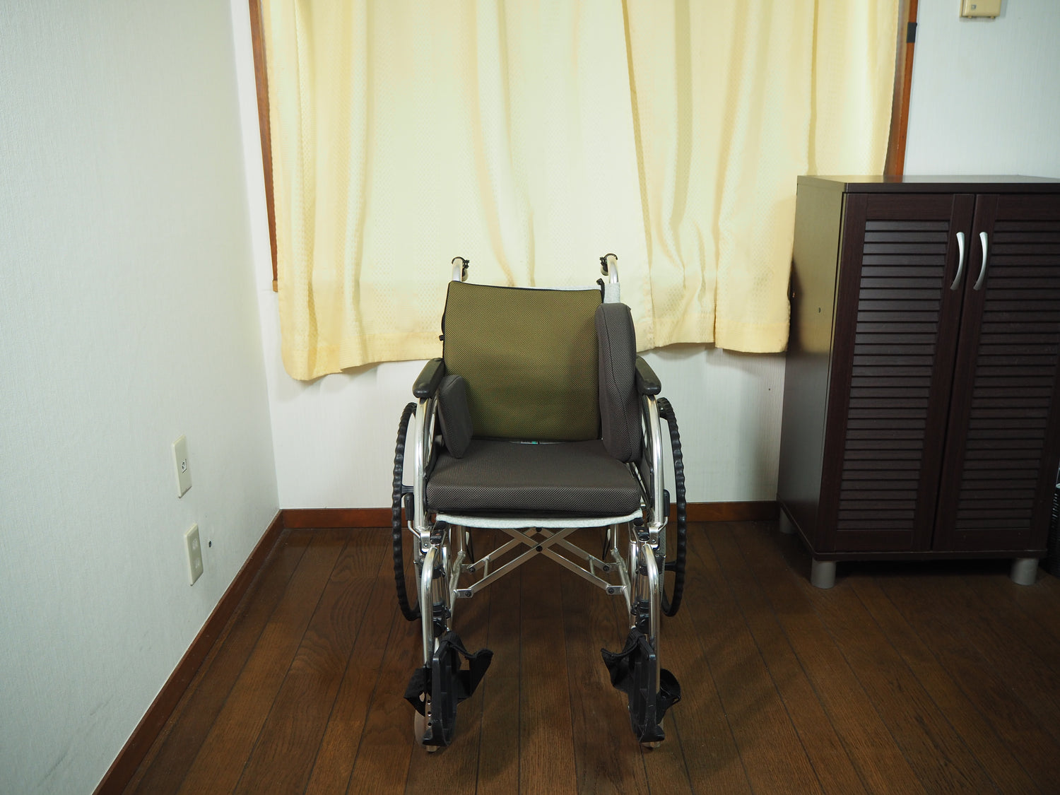 姿勢が不安定で転倒が怖いからと、背もたれのある車いすを利用すると、筋力が下がり、活動レベルが低下する恐れがありますし、お金もかかります。ノビットシステムでは、普通型車いすをそのまま生かし、本人の持っている筋力を活かしながら、転倒予防をすることもできるのです。