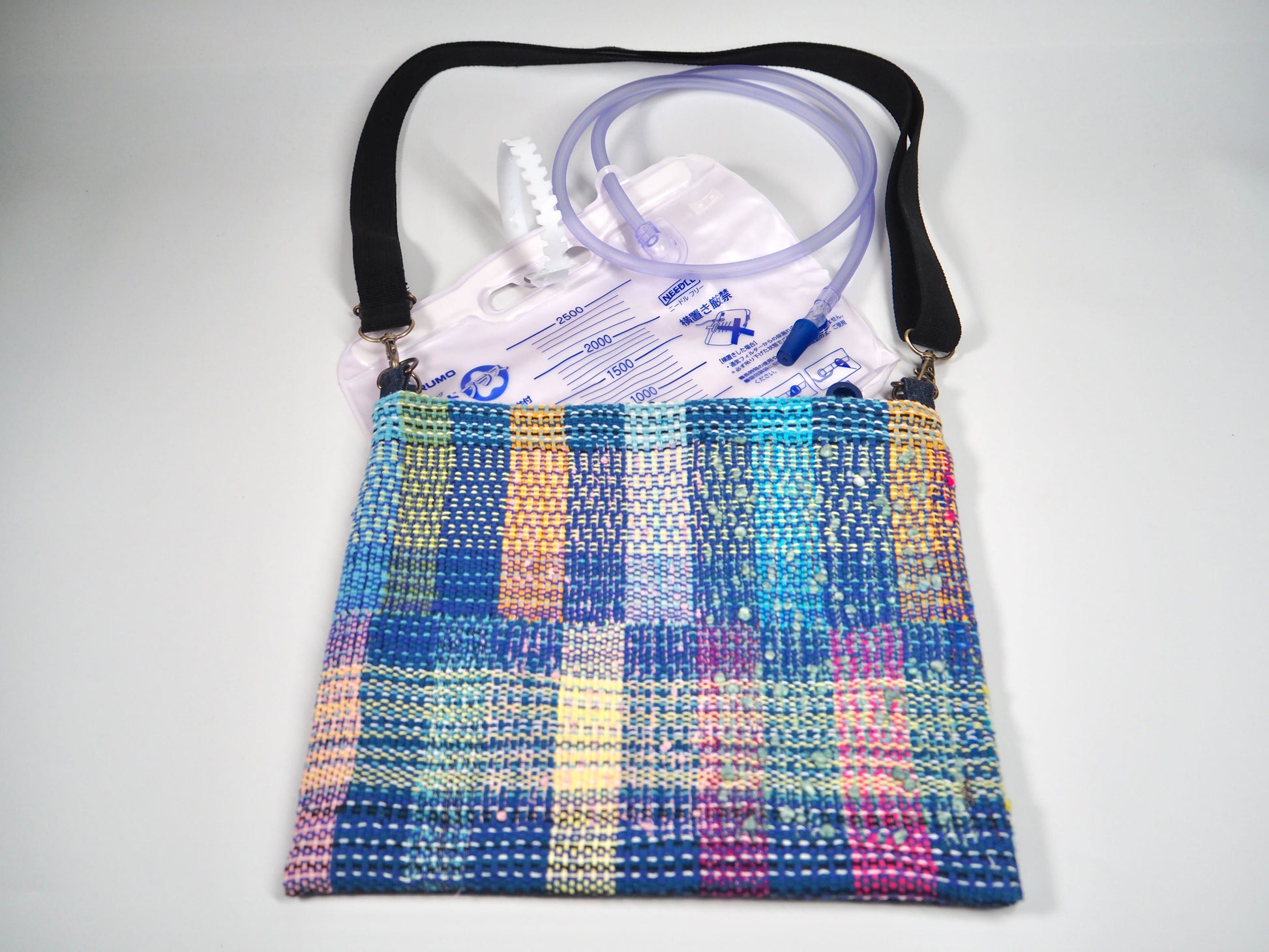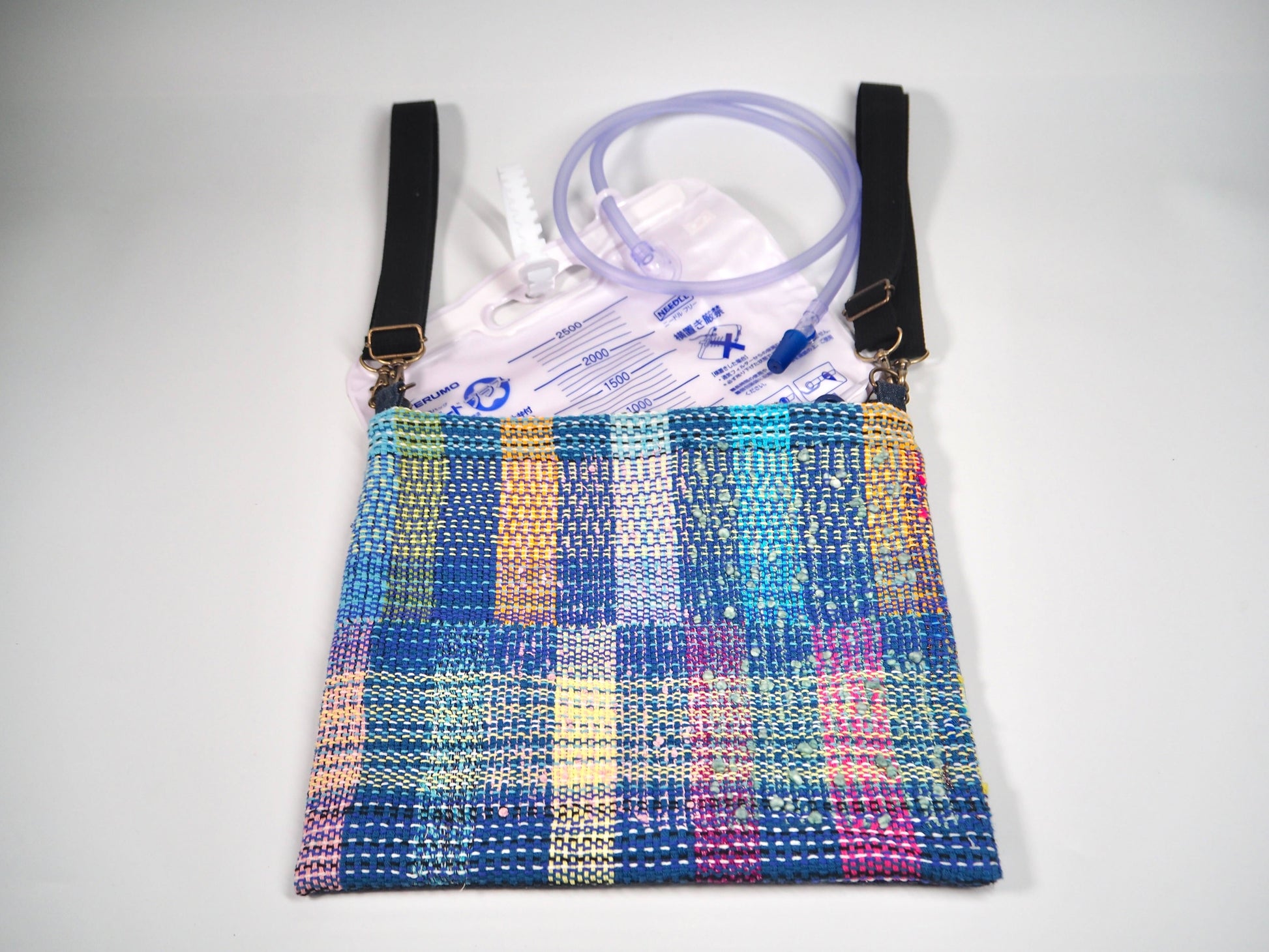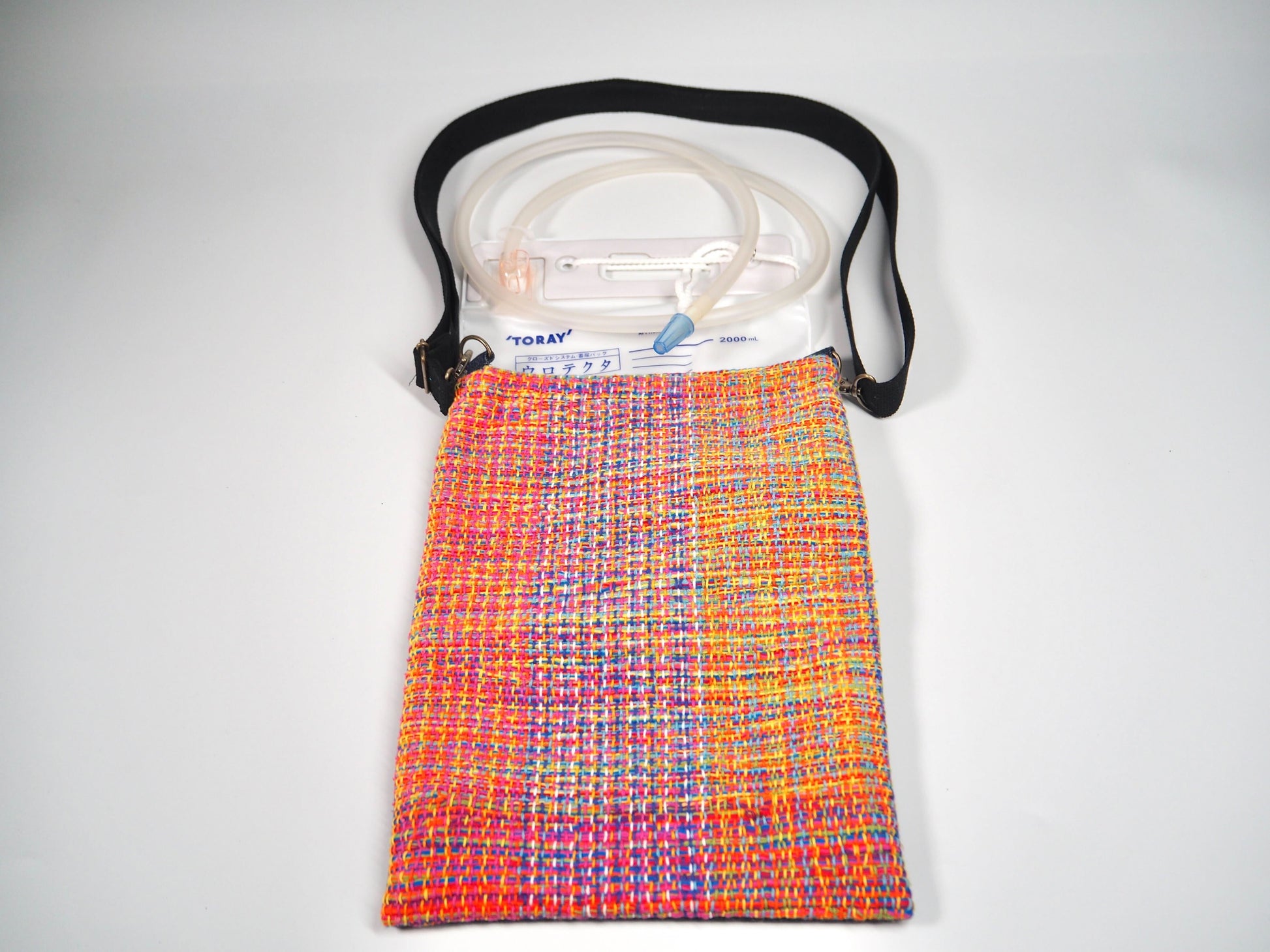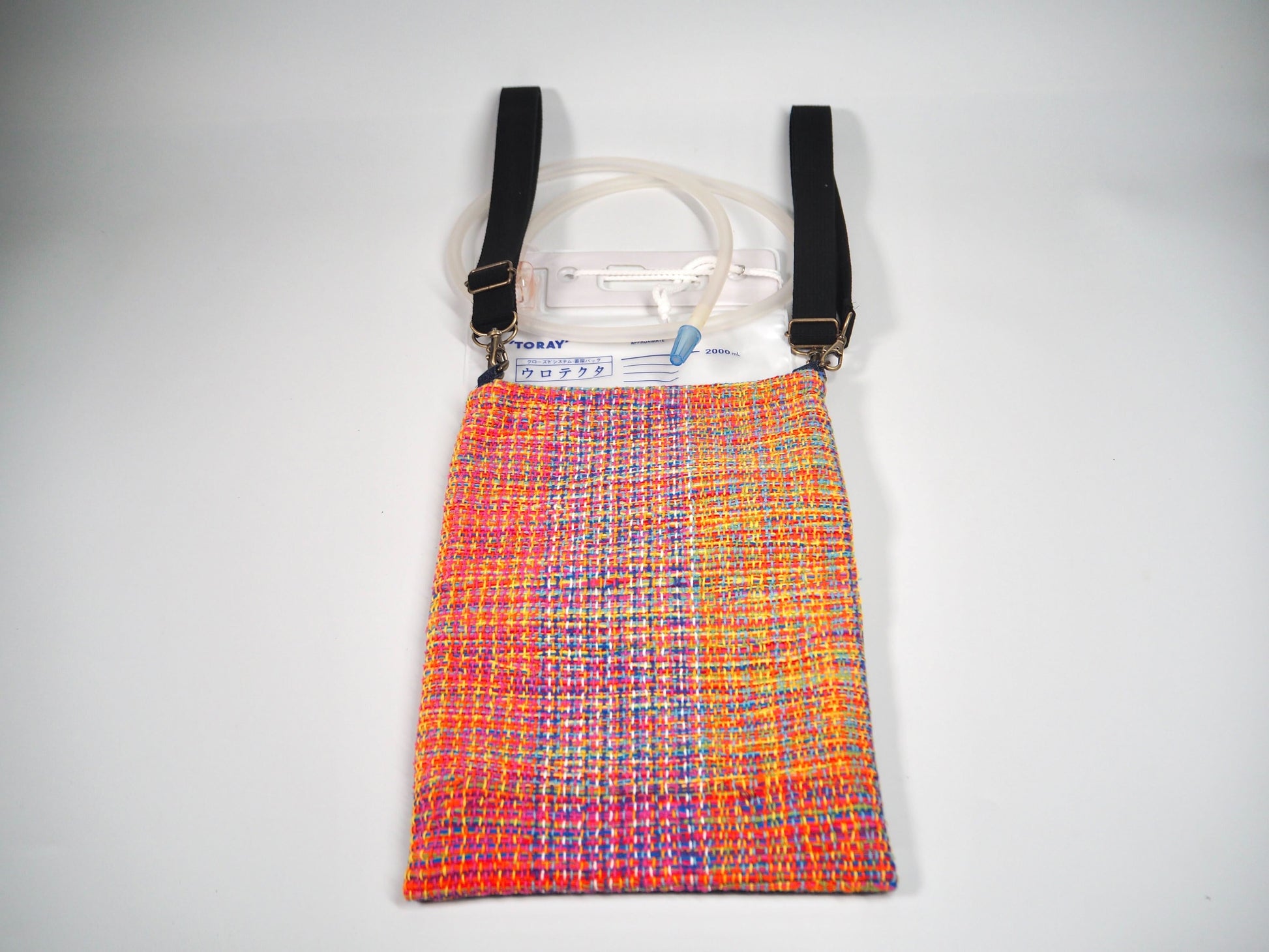 空想庭園的服装品牌使用了他们独特的“さをり織り”技术,设计了一款导尿袋套,可以像背包一样挂在肩上使用,也可以悬挂在轮椅的把手上使用。这款产品既外观精美又功能出众,是一件能够提升使用者心情的优秀商品。