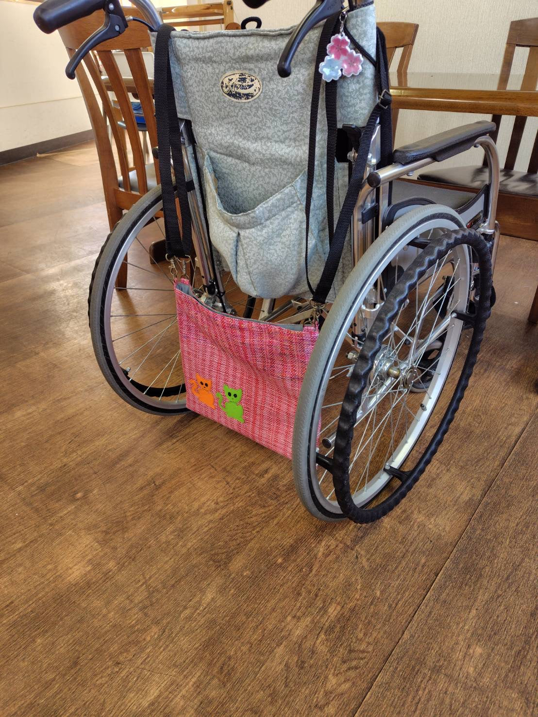 袋部分根据导尿袋的形状制作,各种袋子整齐地放置其中,外观良好。绳子可拆卸,长度可调,适用于步行者、使用轮椅的人、躺椅使用者等各种情况。