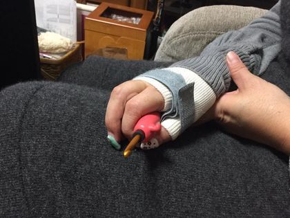 “万能钩针Amiche”诞生的契机,是与一位针织艺人的相遇。这位女士因脑血管疾病导致偏瘫,还患有轻度认知障碍。患病后的她不得已放弃了曾经热爱的编织艺术,也逐渐不再外出。家人十分担心,联系到了Amiche的现任代表人平田女士。平田女士是有名的针织教师,又有着护士的从业经历,向很多患病人士和残疾人教授编织技艺。